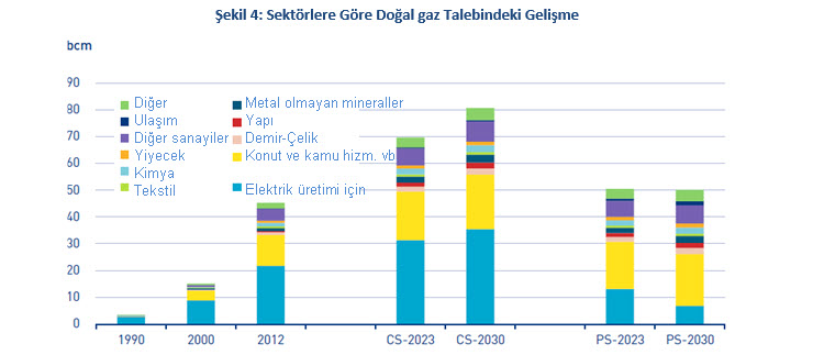 Muhafazakâr Senaryoda, gaz talebi 2030 yılında 80 bcm’yi aşmaktadır. Artışın %60’tan fazlasına, bugün de olduğu gibi, elektrik üretim sektöründen gelen talep artışı neden olacaktır. Proaktif Senaryoda, gaz talebi 2020’lerin başına kadar çok düşük düzeyde artmakta; ancak sonrasında yatay bir seyir izlemektedir. Bunun temel nedeni elektrik üretim amaçlı gaz kullanımındaki ciddi azalıştır.