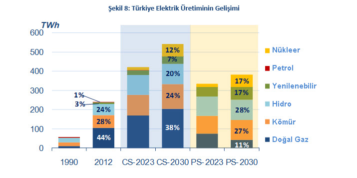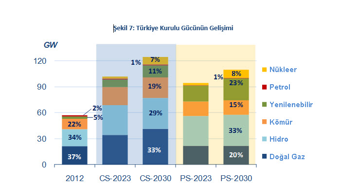 Her iki senaryoda da hidroelektrik santrallerin toplam kurulu gücünün 36 GW’a ulaşması beklenmektedir. OME, nükleer enerji santrallerinin faaliyete geçme tarihlerinde bazı gecikmeler öngörse de, toplam kurulu gücün her iki senaryoda da 2030 yılında 9200 MW’a ulaşacağını tahmin etmektedir. Kömür bazlı santrallerin toplam kurulu gücünün Muhafazakâr Senaryoda %90 (2030 yılında yaklaşık 24 GW’a erişecek şekilde), Proaktif senaryoda ise %36 artması beklenmektedir. Her iki senaryoda da hidro dışında yenilenebilir enerji kaynaklarının toplam kurulu gücünde muazzam bir artış öngörülmektedir. Ayrıca, Muhafazakâr Senaryoda gaz kaynaklı kapasite 2012 ve 2030 yılları arasında iki katına çıkarken, Proaktif senaryoda artış, fiyat ve verimlilik dinamikleri nedeniyle önemsizdir. Brüt elektrik üretiminin 2030 itibariyle Muhafazakâr senaryoda 540 TWh, Proaktif Senaryoda ise 380 TWh’a çıkması beklenmektedir.