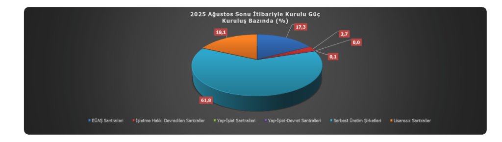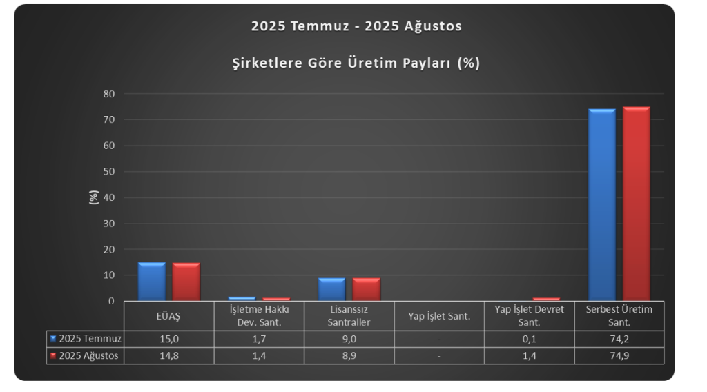 2025 Yılı Ağustos ayında gerçekleşen toplam 34.761 GWh elektrik üretiminin %74,90’ı serbest üretim şirketleri tarafından gerçekleştirilmiştir. Serbest üretim şirketlerinin üretimdeki payı, bir önceki aya göre 0,69 puan artış, geçtiğimiz senenin aynı dönemine göre ise 0,93 puan artış göstermiştir.
