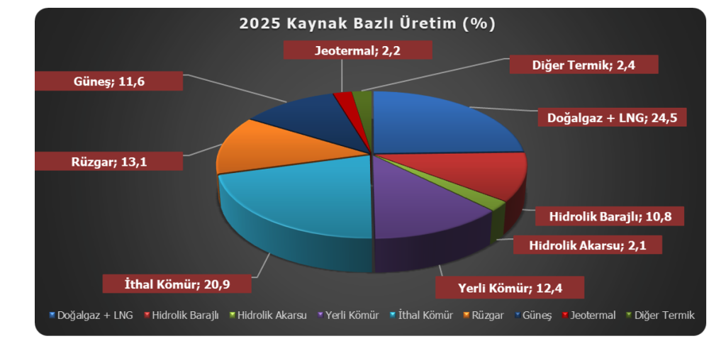Gerçekleşen elektrik üretimi kaynak bakımından incelendiğinde ise, 2025 Ağustos ayında toplam üretimin %24,5’inin doğal gaz ve LNG santralleri tarafından gerçekleştirildiği görülmektedir. Barajlı hidroelektrik santraller, ilgili ayda toplam üretimin %10,8’ini karşılarken, akarsu tipi hidroelektrik santraller ise %2,1 oranıyla üretime katkıda bulunmuştur. İthal kömür santralleri Ağustos ayında toplam üretimin %20,9’unu karşılarken, yerli kömür santralleri ise %12,4 oranında katkı sağlamıştır. Yenilenebilir enerji santrallerinden rüzgâr enerjisi santralleri toplam üretime %13,1 jeotermal ve güneş enerjisi santralleri[2] ise toplam %13,8 oranında katkıda bulunmuştur. Diğer termik santrallerin[3] üretimdeki payı ise %2,4 olarak gerçekleşmiştir.