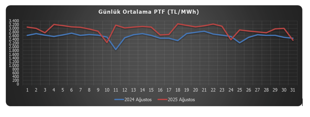 2025 yılı Ağustos ayında pik saatlerde[5] 2.703,82 TL/MWh olarak gerçekleşen ortalama PTF, bir önceki ayın pik saatler ortalaması olan 2.780,27 TL/MWh’lik değere göre %2,7 oranında azalmıştır[6].