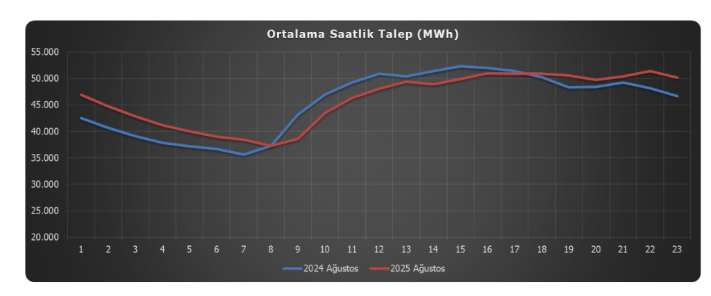 2024 yılı Ağustos ayı içerisinde toplam 33.775 GWh olan elektrik talebi, 2025 yılı Ağustos ayında bir önceki yıla göre %1,77 oranında artış göstererek, 34.370 GWh değerine ulaşmıştır[7]. 2024 yılı Ağustos ayında 45.395 MWh olarak ölçülen saatlik ortalama talep, 2025 yılı Ağustos ayında 46.198 MWh olarak gerçekleşmiştir.