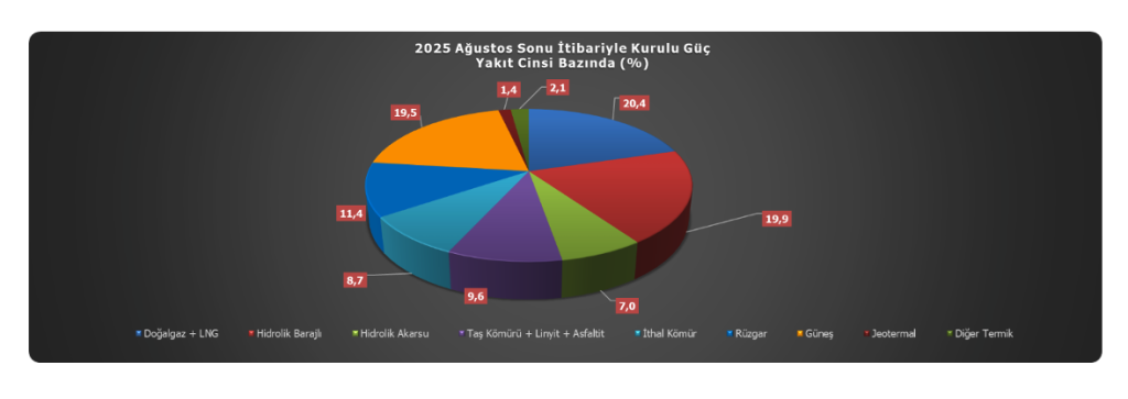 2025 yılı Ağustos ayı sonunda oluşan toplam kurulu gücün %20,4’lük kısmı (24.516 MW) doğal gaz ve LNG yakıt tipi santralleri ile karşılanırken, %19,9’luk kısmı (23.863 MW) barajlı hidrolik santraller tarafından karşılanmaktadır. Bu yakıt tiplerini %9,6’lık (11.477 MW) oran ile yerli kömür[9] santralleri ve %8,7’lik oran (10.456 MW) ile ithal kömür santralleri izlemektedir. Akarsu tipi hidrolik santraller %7,0’lık bir orana (8.426 MW) sahipken, rüzgâr santralleri toplam kurulu gücün %11,4’lük bir kısmını (13.697 MW) oluşturmaktadır[10]. Toplam kurulu gücün %19,5’lik kısmı (23.438 MW) güneş enerjisi santralleri, %1,4’lük kısmı (1.734 MW) jeotermal enerji santrallerinden oluşurken, %2,1’lik kısmı (2.569 MW) ise diğer termik santraller[11] tarafından oluşturulmaktadır.