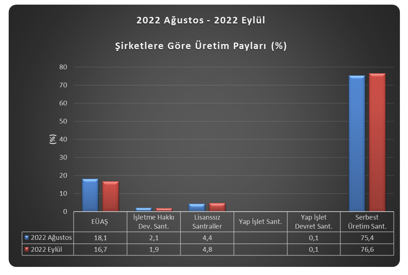 2022 Yılı Eylül ayında gerçekleşen toplam 26.837 GWh elektrik üretiminin %76,56’sı serbest üretim şirketleri tarafından gerçekleştirilmiştir. Serbest üretim şirketlerinin üretimdeki payı, bir önceki aya göre 1,20 puan artmıştır, geçtiğimiz senenin aynı dönemine göre ise 1,84 puan düşüş göstermiştir.