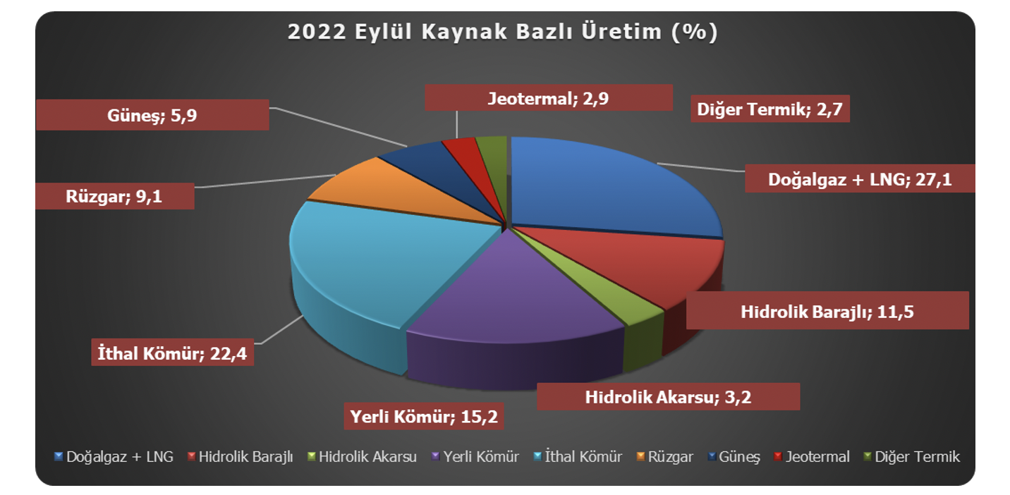 Gerçekleşen elektrik üretimi kaynak bakımından incelendiğinde ise, 2022 Eylül ayında toplam üretimin %27,1’inin doğalgaz ve LNG santralleri tarafından gerçekleştirildiği görülmektedir. Barajlı hidroelektrik santraller, ilgili ayda toplam üretimin %11,5’ini karşılarken, akarsu tipi hidroelektrik santraller ise %3,2 oranıyla üretime katkıda bulunmuştur. İthal kömür santralleri Eylül ayında toplam üretimin %14,6’sını karşılarken, yerli kömür santralleri ise %15,2 oranında katkı sağlamıştır. Yenilenebilir enerji santrallerinden rüzgâr enerjisi santralleri toplam üretime %9,1 jeotermal ve güneş enerjisi santralleri[2] ise %8,8 oranında katkıda bulunmuştur. Diğer termik santrallerin[3] üretimdeki payı ise %2,7 olarak gerçekleşmiştir.