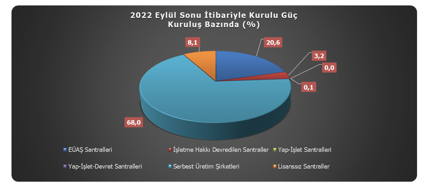 Toplam kurulu gücün %68,0’lik (69.508 MW) kısmını serbest üretim şirketleri oluştururken, EÜAŞ santrallerinin toplam kurulu güçteki payı %20,6 (20.995 MW) seviyesindedir[8]. Yap işlet devret santralleri %0,1’lik (116 MW), işletme hakkı devredilen santraller %3,2’lik (3,275 MW) bir orana sahiptir. Lisanssız santrallerin toplam kurulu güç içindeki payı da %8,1 (8.257 MW) olarak kaydedilmiştir.