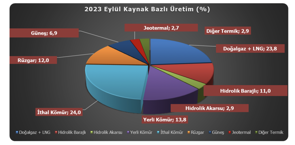 Gerçekleşen elektrik üretimi kaynak bakımından incelendiğinde ise, 2023 Eylül ayında toplam üretimin %23,8’inin doğal gaz ve LNG santralleri tarafından gerçekleştirildiği görülmektedir. Barajlı hidroelektrik santraller, ilgili ayda toplam üretimin %11,0’ını karşılarken, akarsu tipi hidroelektrik santraller ise %2,9 oranıyla üretime katkıda bulunmuştur. İthal kömür santralleri Eylül ayında toplam üretimin %24,0’ını karşılarken, yerli kömür santralleri ise %13,8 oranında katkı sağlamıştır. Yenilenebilir enerji santrallerinden rüzgâr enerjisi santralleri toplam üretime %12,0 jeotermal ve güneş enerjisi santralleri[2] ise toplam %9,6 oranında katkıda bulunmuştur. Diğer termik santrallerin[3] üretimdeki payı ise %2,9 olarak gerçekleşmiştir.