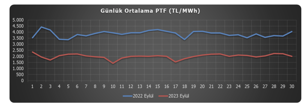 2023 yılı Eylül ayında pik saatlerde[5] 2.051,22 TL/MWh olarak gerçekleşen ortalama PTF, bir önceki ayın pik saatler ortalaması olan 1.965,40 TL/MWh’lik değere göre %4,4 oranında artmıştır[6].