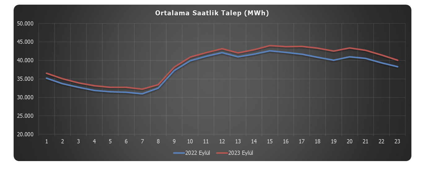 2022 yılı Eylül ayı içerisinde toplam 27,608 GWh olan elektrik talebi, 2023 yılı Eylül ayında bir önceki yıla göre %2,39 oranında artış göstererek, 28,267 GWh değerine ulaşmıştır[7]. 2022 yılı Eylül ayında 37,759 MWh olarak ölçülen saatlik ortalama talep, 2023 yılı Eylül ayında 39.260 MWh olarak gerçekleşmiştir.