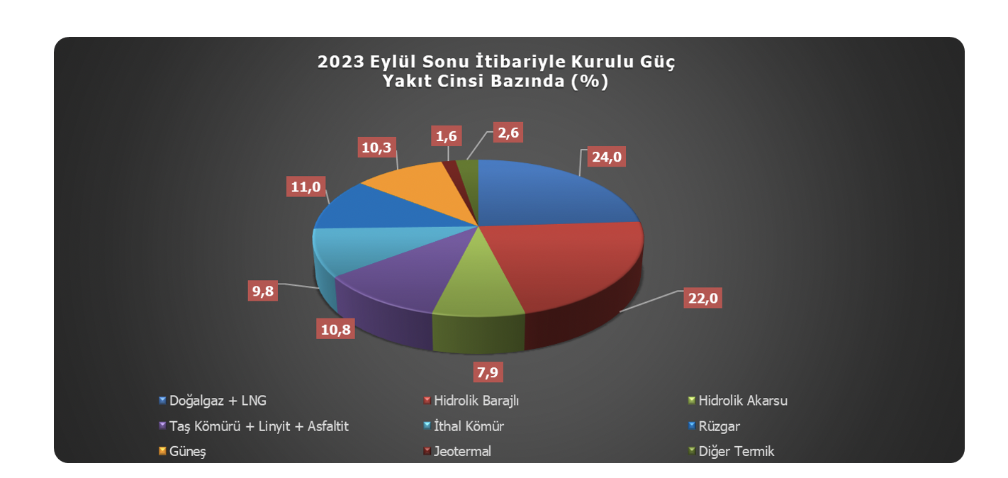 2023 yılı Eylül ayı sonunda oluşan toplam kurulu gücün %24,0’lık kısmı (25.356 MW) doğal gaz ve LNG yakıt tipi santralleri ile karşılanırken, %22,0’lık kısmı (23.285 MW) barajlı hidrolik santraller tarafından karşılanmaktadır. Bu yakıt tiplerini %10,8’lik (11.440 MW) oran ile yerli kömür[9] santralleri ve %9,8’lik oran (10.374 MW) ile ithal kömür santralleri izlemektedir. Akarsu tipi hidrolik santraller %7,9’luk bir orana (8.310 MW) sahipken, rüzgâr santralleri toplam kurulu gücün %11,0’lık bir kısmını (11.602 MW) oluşturmaktadır[10]. Toplam kurulu gücün %10,3’lük kısmı (10.899 MW) güneş enerjisi santralleri, %1,6’lık kısmı (1.691 MW) jeotermal enerji santrallerinden oluşurken, %2,6’lık kısmı (2.704 MW) ise diğer termik santraller[11] tarafından oluşturulmaktadır.