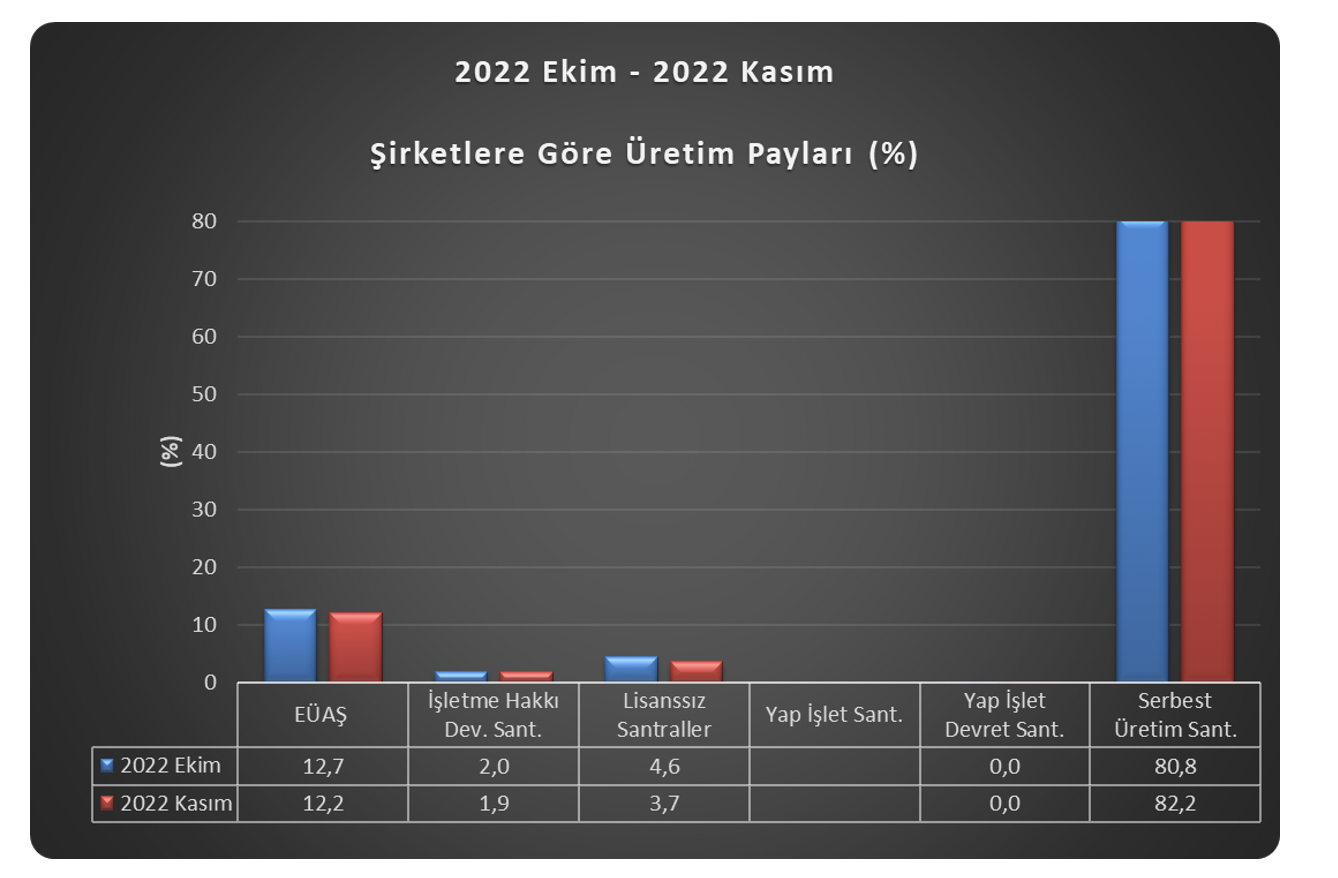 2022 Yılı Kasım ayında gerçekleşen toplam 24.411 GWh elektrik üretiminin %82,23’ü serbest üretim şirketleri tarafından gerçekleştirilmiştir. Serbest üretim şirketlerinin üretimdeki payı, bir önceki aya göre 1,47 puan artmıştır, geçtiğimiz senenin aynı dönemine göre ise 1,14 puan artış göstermiştir.