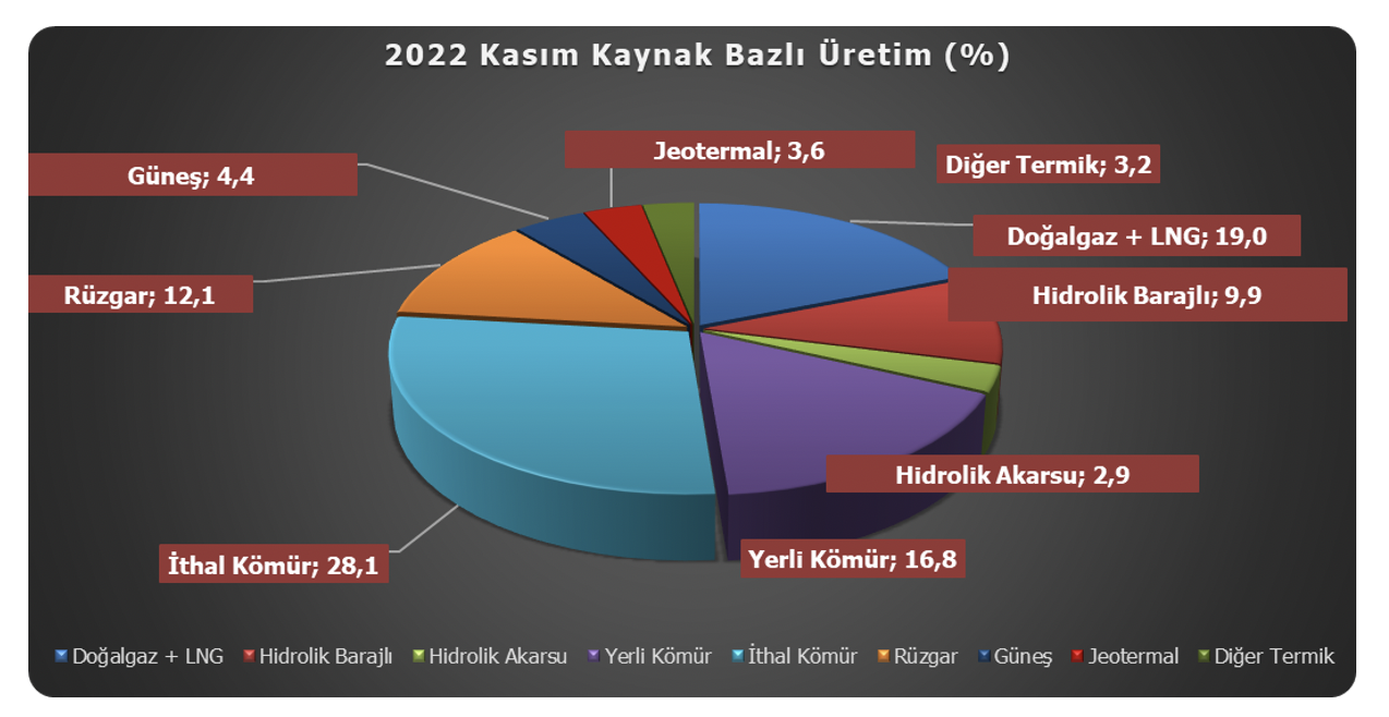 TEİAŞ tarafından yayımlanan üretim verilerine göre, 2022 Kasım ayında termik santrallerin gerçekleşen toplam üretimdeki payı %67,05 olarak kaydedilmiştir. Yenilenebilir enerji kaynaklarından elde edilen elektrik üretiminin payı ise %32,95 olarak gerçekleşmiştir[4].