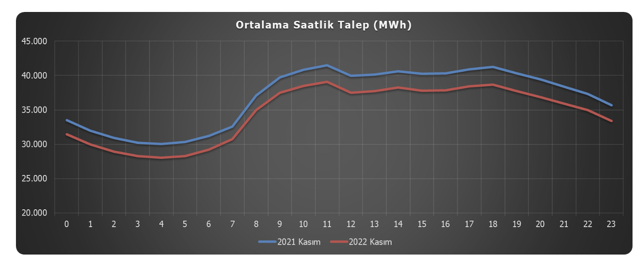 2021 yılı Kasım ayı içerisinde toplam 26.676 GWh olan elektrik talebi, 2022 yılı Kasım ayında bir önceki yıla göre %6,62 oranında düşüş göstererek, 24.911 GWh değerine ulaşmıştır[7]. 2021 yılı Kasım ayında 36.851 MWh olarak ölçülen saatlik ortalama talep, 2022 yılı Kasım ayında 34.598 MWh olarak gerçekleşmiştir.