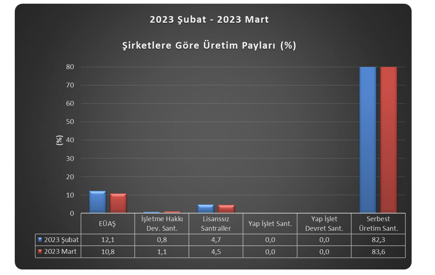 2023 Yılı Mart ayında gerçekleşen toplam 25.975 GWh elektrik üretiminin %83,59’u serbest üretim şirketleri tarafından gerçekleştirilmiştir. Serbest üretim şirketlerinin üretimdeki payı, bir önceki aya göre 1,30 puan, geçtiğimiz senenin aynı dönemine göre ise 6,41 puan artış göstermiştir.