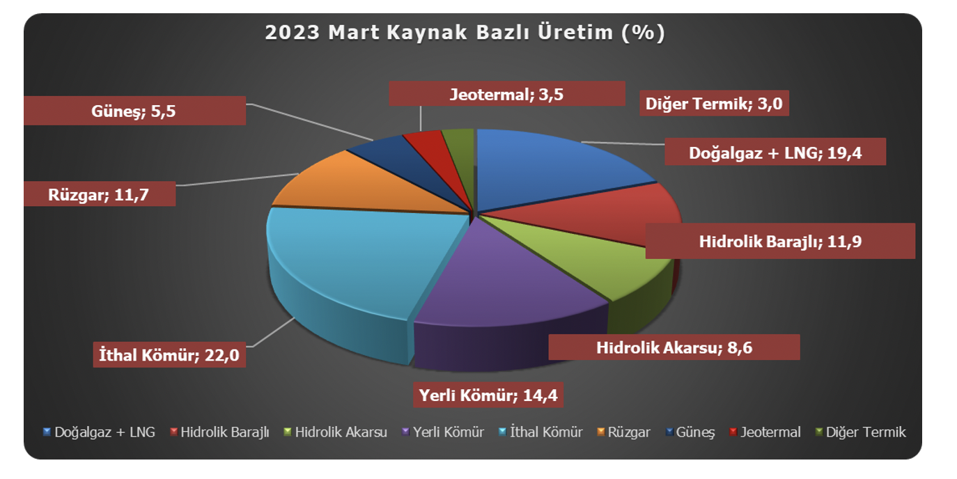 TEİAŞ tarafından yayımlanan üretim verilerine göre, 2023 Mart ayında termik santrallerin gerçekleşen toplam üretimdeki payı %58,81 olarak kaydedilmiştir. Yenilenebilir enerji kaynaklarından elde edilen elektrik üretiminin payı ise %41,19 olarak gerçekleşmiştir[4].