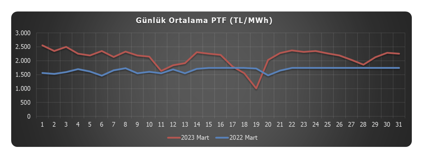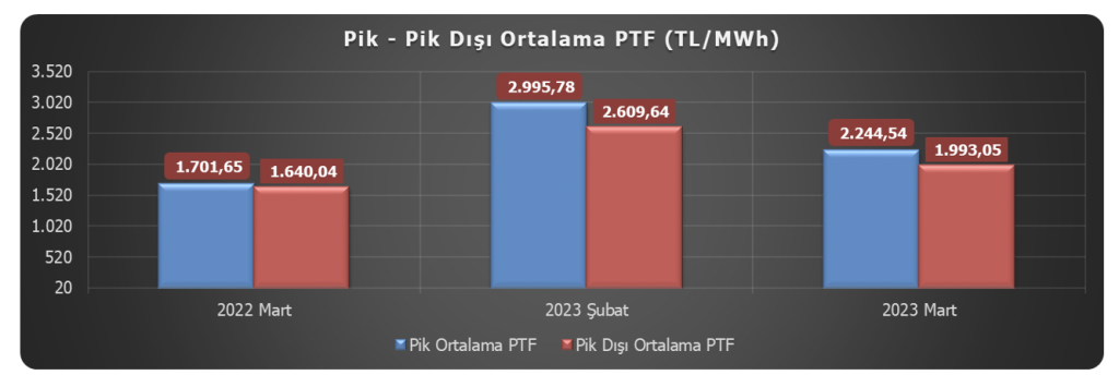 2023 yılı Mart ayında pik saatlerde[5] 2.244,54 TL/MWh olarak gerçekleşen ortalama PTF, bir önceki ayın pik saatler ortalaması olan 2.995,78 TL/MWh’lik değere göre %25,1 oranında azalmıştır[6].