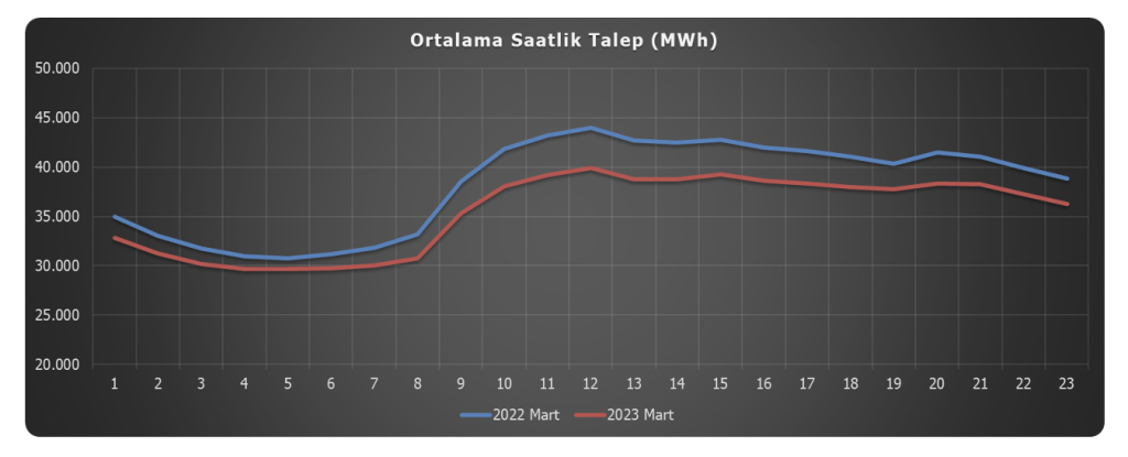 2022 yılı Mart ayı içerisinde toplam 28,662 GWh olan elektrik talebi, 2023 yılı Mart ayında bir önceki yıla göre %7,99 oranında düşüş göstererek, 26,371 GWh değerine ulaşmıştır[7]. 2022 yılı Mart ayında 38.192 MWh olarak ölçülen saatlik ortalama talep, 2023 yılı Mart ayında 35.446 MWh olarak gerçekleşmiştir.