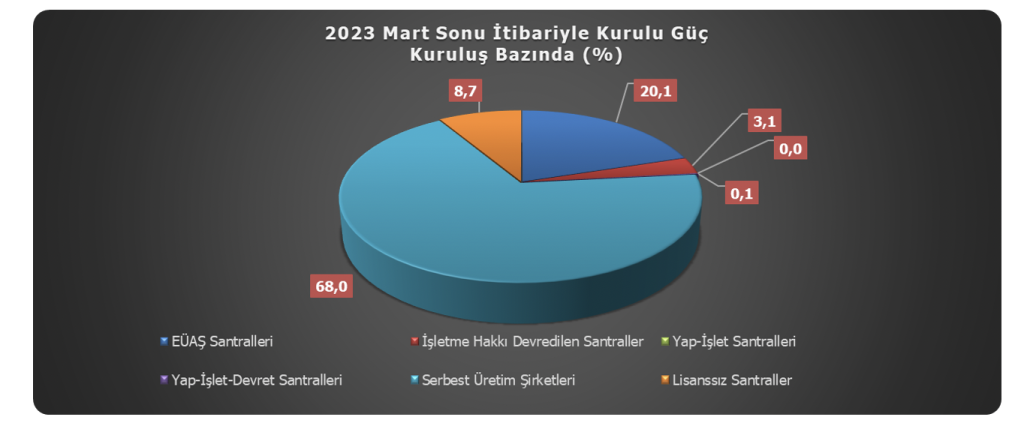 Toplam kurulu gücün %68,0’lik (70.926 MW) kısmını serbest üretim şirketleri oluştururken, EÜAŞ santrallerinin toplam kurulu güçteki payı %20,1 (20.995 MW) seviyesindedir[8]. Yap işlet devret santralleri %0,1’lik (116 MW), işletme hakkı devredilen santraller %3,1’lik (3,275 MW) bir orana sahiptir. Lisanssız santrallerin toplam kurulu güç içindeki payı da %8,7 (9.040 MW) olarak kaydedilmiştir.