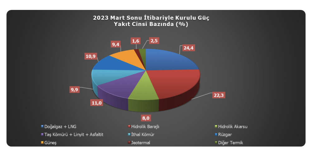 2023 yılı Mart ayı sonunda oluşan toplam kurulu gücün %24,4’lük kısmı (25.414 MW) doğalgaz ve LNG yakıt tipi santralleri ile karşılanırken, %22,3’lük kısmı (23.275 MW) barajlı hidrolik santraller tarafından karşılanmaktadır. Bu yakıt tiplerini %11,0’lık (11.437 MW) oran ile yerli kömür[9] santralleri ve %9,9’luk oran (10.374 MW) ile ithal kömür santralleri izlemektedir. Akarsu tipi hidrolik santraller %8,0’lik bir orana (8.296 MW) sahipken, rüzgâr santralleri toplam kurulu gücün %10,9’luk bir kısmını (11.405 MW) oluşturmaktadır[10]. Toplam kurulu gücün %9,4’lük kısmı (9.820 MW) güneş enerjisi santralleri, %1,6’lık kısmı (1.719 MW) jeotermal enerji santrallerinden oluşurken, %2,5’lik kısmı (2.611 MW) ise diğer termik santraller[11] tarafından oluşturulmaktadır.