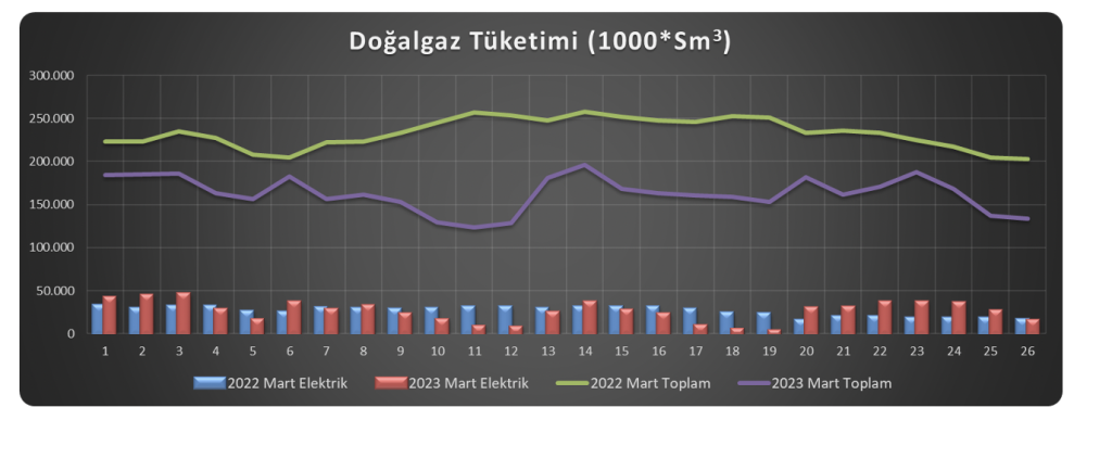 2022 yılı Mart ayında 6,060 milyar m3 olarak kaydedilen toplam doğalgaz tüketimi, 2023 yılı Mart ayının aynı döneminde %30,2 oranında bir düşüş ile 4,232 milyar m3 olarak gerçekleşmiştir. Elektrik santrallerinde tüketilen doğal gaz miktarı 2022 yılı Mart ayında 0,673 milyar m3 iken bu miktar, 2023 yılının aynı döneminde %0,1 oranında artarak 0,672 milyar m3 olarak kaydedilmiştir[12]. Elektrik santrallerinde tüketilen doğalgaz miktarının toplam doğalgaz tüketimine oranı 2022 yılı Mart ayında 11,1 iken, bu oran 2023 Mart ayında %15,9 olarak gerçekleşmiştir. [13]