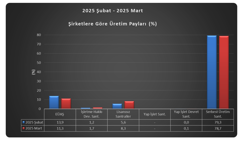 2025 Yılı Mart ayında gerçekleşen toplam 28.018 GWh elektrik üretiminin %78,74’ü serbest üretim şirketleri tarafından gerçekleştirilmiştir. Serbest üretim şirketlerinin üretimdeki payı, bir önceki aya göre 0,51 puan azalış, geçtiğimiz senenin aynı dönemine göre ise 2,15 puan artış göstermiştir.