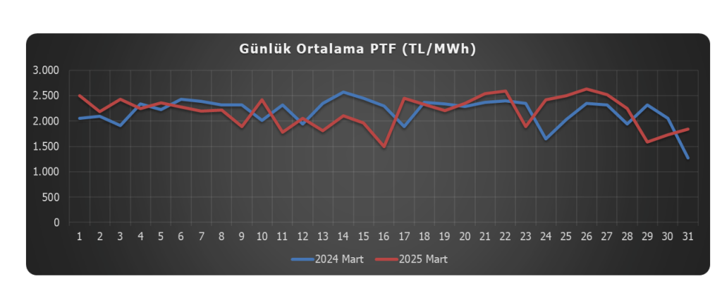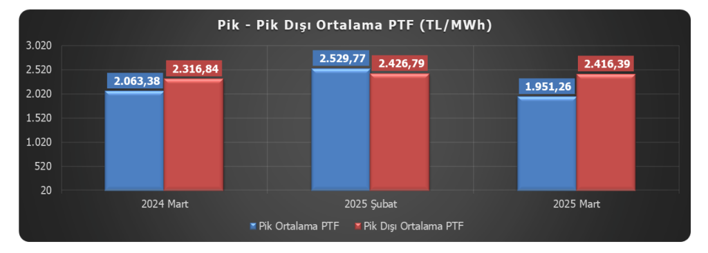 2025 yılı Mart ayında pik saatlerde[5] 1.951,26 TL/MWh olarak gerçekleşen ortalama PTF, bir önceki ayın pik saatler ortalaması olan 2.529,77 TL/MWh’lik değere göre %22,9 oranında azalmıştır[6].