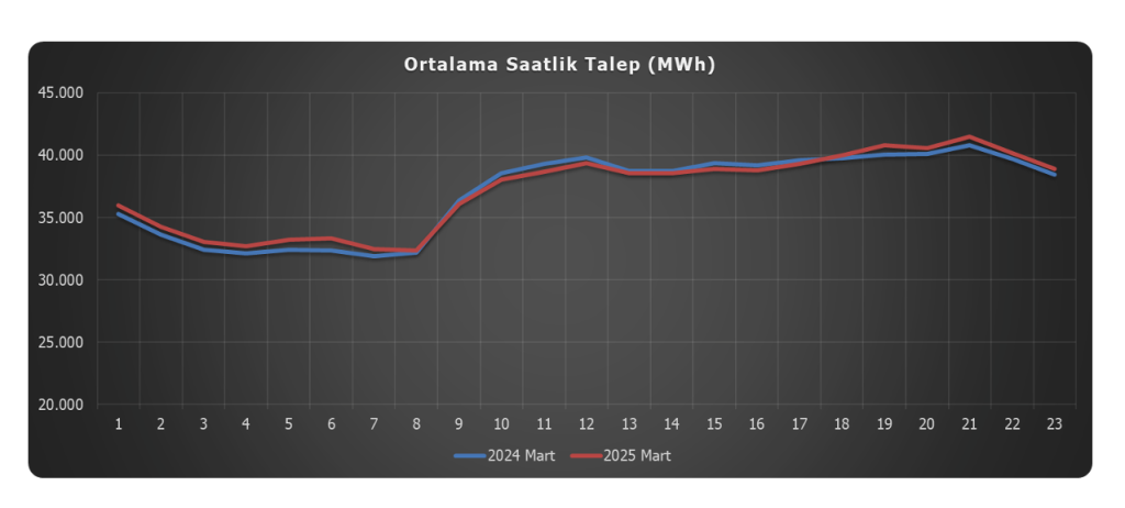 2024 yılı Mart ayı içerisinde toplam 27.965 GWh olan elektrik talebi, 2025 yılı Mart ayında bir önceki yıla göre %0,97 oranında azalış göstererek, 27.693 GWh değerine ulaşmıştır[7]. 2024 yılı Mart ayında 37.587 MWh olarak ölçülen saatlik ortalama talep, 2025 yılı Mart ayında 37.222 MWh olarak gerçekleşmiştir.
