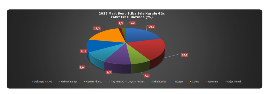 2025 yılı Mart ayı sonunda oluşan toplam kurulu gücün %20,9’luk kısmı (24.603 MW) doğal gaz ve LNG yakıt tipi santralleri ile karşılanırken, %20,2’lik kısmı (23.863 MW) barajlı hidrolik santraller tarafından karşılanmaktadır. Bu yakıt tiplerini %9,7’lik (11.480 MW) oran ile yerli kömür[9] santralleri ve %8,9’luk oran (10.456 MW) ile ithal kömür santralleri izlemektedir. Akarsu tipi hidrolik santraller %7,1’lik bir orana (8.358 MW) sahipken, rüzgâr santralleri toplam kurulu gücün %11,1’lik bir kısmını (13.098 MW) oluşturmaktadır[10]. Toplam kurulu gücün %18,3’lük kısmı (21.630 MW) güneş enerjisi santralleri, %1,5’lik kısmı (1.734 MW) jeotermal enerji santrallerinden oluşurken, %2,3’lük kısmı (2.664 MW) ise diğer termik santraller[11] tarafından oluşturulmaktadır.