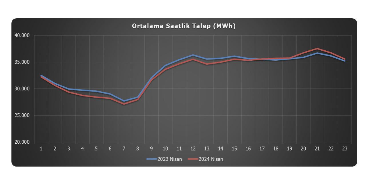 2023 yılı Nisan ayı içerisinde toplam 24,150 GWh olan elektrik talebi, 2024 yılı Nisan ayında bir önceki yıla göre %1,05 oranında düşüş göstererek, 23,896 GWh değerine ulaşmıştır[7]. 2023 yılı Nisan ayında 33.488 MWh olarak ölçülen saatlik ortalama talep, 2024 yılı Nisan ayında 33.190 MWh olarak gerçekleşmiştir.