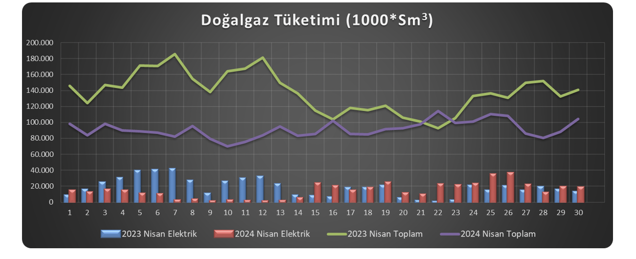 2023 yılı Nisan ayında 4,133 milyar m3 olarak kaydedilen toplam doğal gaz tüketimi, 2024 yılı Nisan ayının aynı döneminde %33,6 oranında bir azalış ile 2,743 milyar m3 olarak gerçekleşmiştir. Elektrik santrallerinde tüketilen doğal gaz miktarı 2023 yılı Nisan ayında 0,539 milyar m3 iken bu miktar, 2024 yılının aynı döneminde %23,39 oranında azalarak 0,413 milyar m3 olarak kaydedilmiştir[12]. Elektrik santrallerinde tüketilen doğal gaz miktarının toplam doğal gaz tüketimine oranı 2023 yılı Nisan ayında 13,1 iken, bu oran 2024 Nisan ayında %15,1 olarak gerçekleşmiştir.