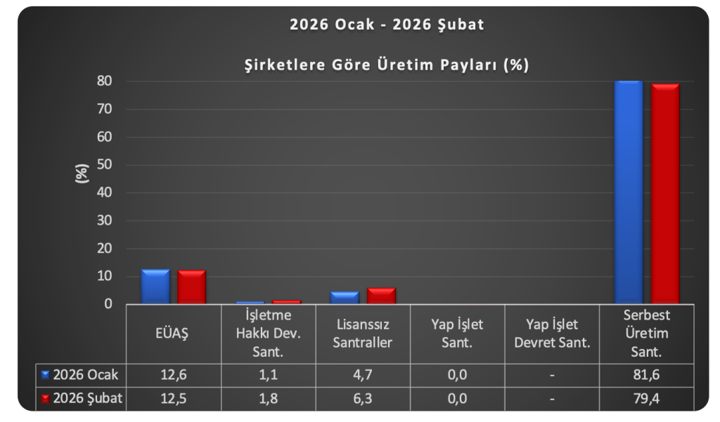2026 Yılı şubat ayında gerçekleşen toplam 21.952 GWh elektrik üretiminin %79,43’ü serbest üretim şirketleri tarafından gerçekleştirilmiştir. Serbest üretim şirketlerinin üretimdeki payı, bir önceki aya göre 2,19 puan düşmüş, geçtiğimiz senenin aynı dönemine göre ise 0,18 puan artış göstermiştir.