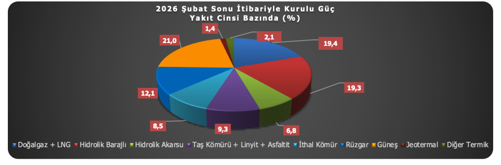 2026 yılı şubat ayı sonunda oluşan toplam kurulu gücün %19,4’lük kısmı (23.916 MW) doğal gaz ve LNG yakıt tipi santralleri ile karşılanırken, %19,3’lük kısmı (23.869 MW) barajlı hidrolik santraller tarafından karşılanmaktadır. Bu yakıt tiplerini %9,3’lük (11.535 MW) oran ile yerli kömür[9] santralleri ve %8,5’lik oran (10.462 MW) ile ithal kömür santralleri izlemektedir. Akarsu tipi hidrolik santraller %6,8’lik bir orana (8.428 MW) sahipken, rüzgâr santralleri toplam kurulu gücün %12,1’lik bir kısmını (14.915 MW) oluşturmaktadır[10]. Toplam kurulu gücün %21,0’lık kısmı (25.961 MW) güneş enerjisi santralleri, %1,4’lük kısmı (1.759 MW) jeotermal enerji santrallerinden oluşurken, %2,1’lik kısmı (2.609 MW) ise diğer termik santraller[11] tarafından oluşturulmaktadır.