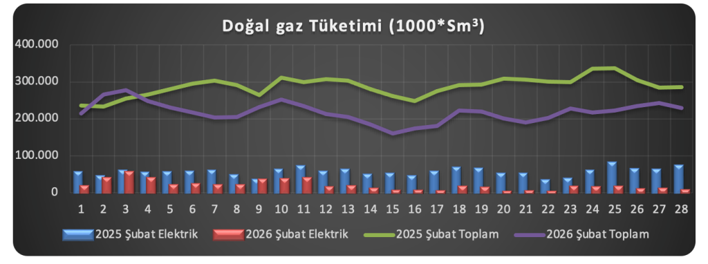 [12] 2026 yılı şubat ayı Elektrik üretimi için tüketilen toplam doğal gaz miktarı, T.C. Enerji ve Tabii Kaynaklar Bakanlığı Enerji İşleri Genel Müdürlüğü raporlarından alınmaktadır.