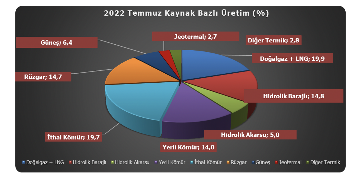 TEİAŞ tarafından yayımlanan üretim verilerine göre, 2022 Temmuz ayında termik santrallerin gerçekleşen toplam üretimdeki payı %56,43 olarak kaydedilmiştir. Yenilenebilir enerji kaynaklarından elde edilen elektrik üretiminin payı ise %43,57 olarak gerçekleşmiştir[4].
