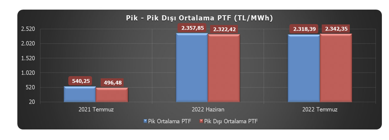 2022 yılı Temmuz ayında pik saatlerde[5] 2.318,39 TL/MWh olarak gerçekleşen ortalama PTF, bir önceki ayın pik saatler ortalaması olan 2.357,85 TL/MWh’lik değere göre %1,7 oranında düşmüştür[6].