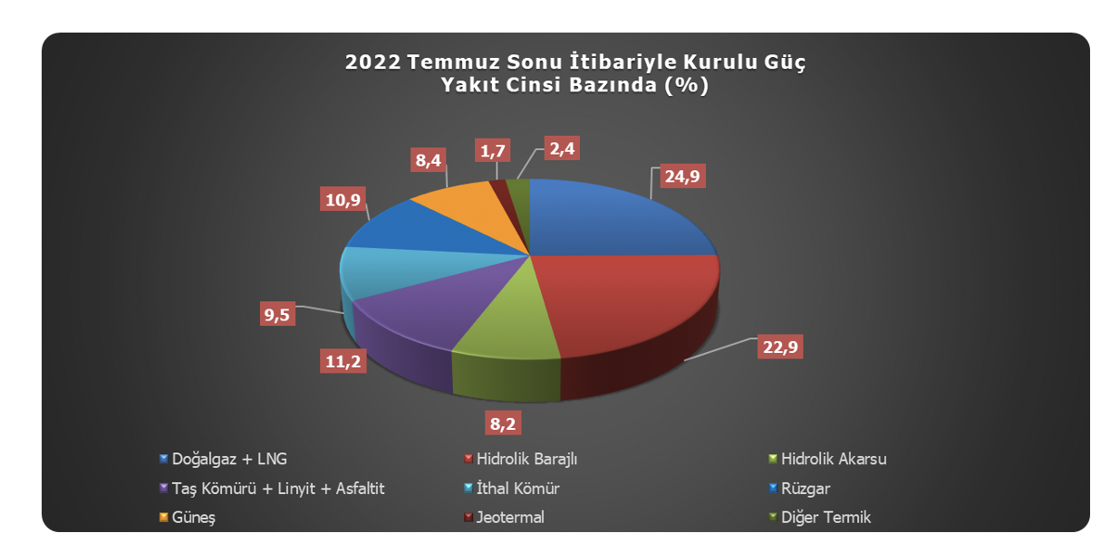2022 yılı Temmuz ayı sonunda oluşan toplam kurulu gücün %24,9’luk kısmı (25.298 MW) doğalgaz ve LNG yakıt tipi santralleri ile karşılanırken, %22,9’luk kısmı (23.275 MW) barajlı hidrolik santraller tarafından karşılanmaktadır. Bu yakıt tiplerini %11,2’lik (11.388 MW) oran ile yerli kömür[9] santralleri ve %9,5’lik oran (9.714 MW) ile ithal kömür santralleri izlemektedir. Akarsu tipi hidrolik santraller %8,2’lik bir orana (8.293 MW) sahipken, rüzgâr santralleri toplam kurulu gücün %10,9’luk bir kısmını (11.054 MW) oluşturmaktadır[10]. Toplam kurulu gücün %8,4’lük kısmı (8.591 MW) güneş enerjisi santralleri, %1,7’lik kısmı (1.686 MW) jeotermal enerji santrallerinden oluşurken, %2,4’lük kısmı (2.451 MW) ise diğer termik santraller[11] tarafından oluşturulmaktadır.