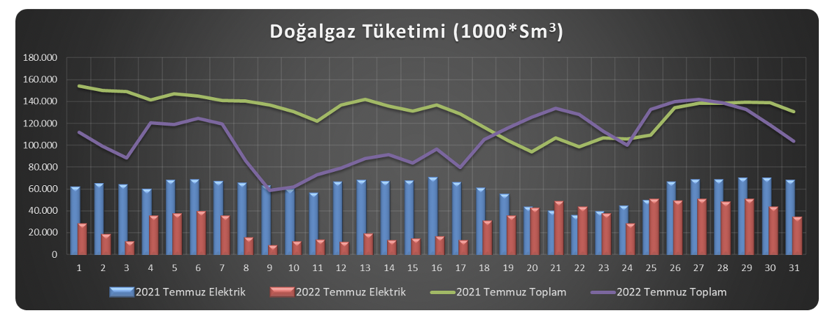 2021 yılı Temmuz ayında 4,031 milyar m3 olarak kaydedilen toplam doğalgaz tüketimi, 2022 yılı Temmuz ayının aynı döneminde %17,9 oranında bir düşüş ile 3,309.6 milyar m3 olarak gerçekleşmiştir. Elektrik santrallerinde tüketilen doğal gaz miktarı 2021 yılı Temmuz ayında 1,850 milyar m3 iken bu miktar, 2022 yılının aynı döneminde %53,2 oranında düşerek 0,901 milyar m3 olarak kaydedilmiştir[12]. Elektrik santrallerinde tüketilen doğalgaz miktarının toplam doğalgaz tüketimine oranı 2021 yılı Temmuz ayında 45,9 iken, bu oran 2022 Temmuz ayında %27,2 olarak gerçekleşmiştir.