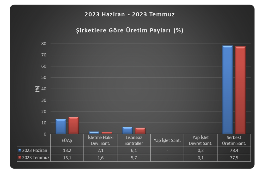 2023 Yılı Temmuz ayında gerçekleşen toplam 31.031 GWh elektrik üretiminin %77,51’i serbest üretim şirketleri tarafından gerçekleştirilmiştir. Serbest üretim şirketlerinin üretimdeki payı, bir önceki aya göre 0,86 puan düşüş, geçtiğimiz senenin aynı dönemine göre ise 0,65 puan artış göstermiştir.