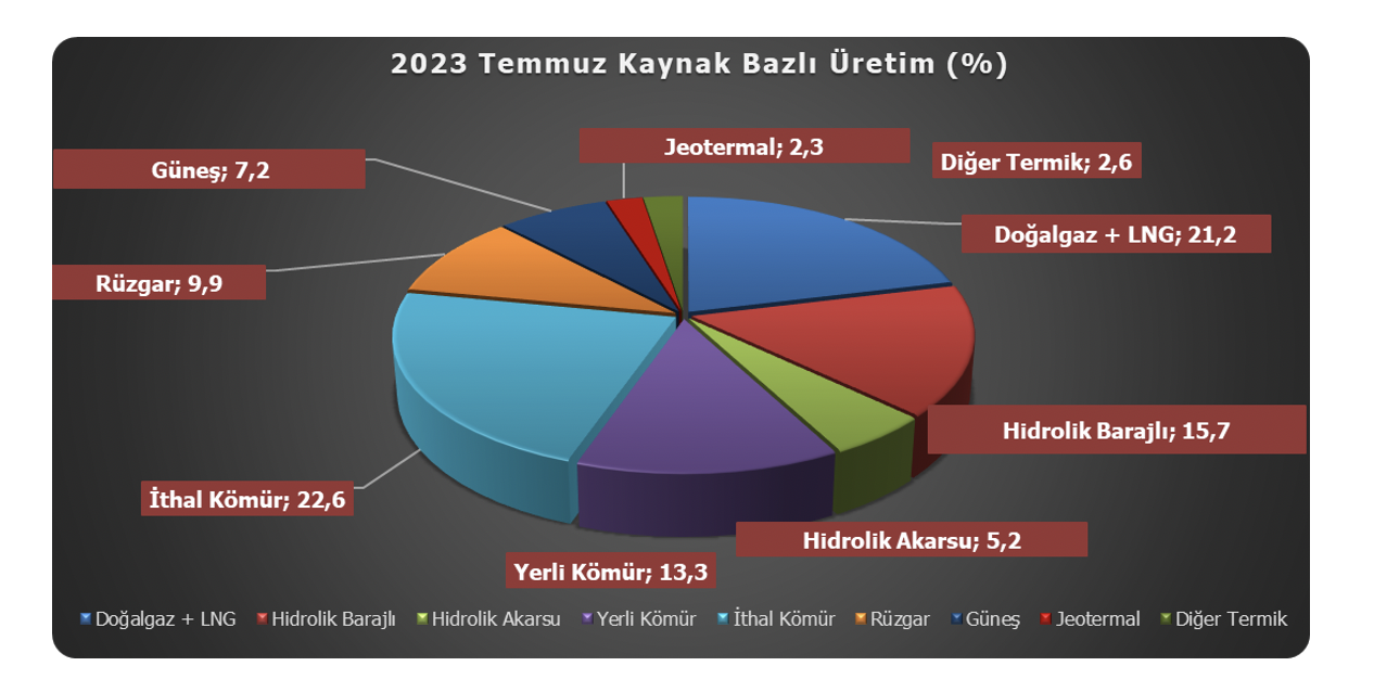 Gerçekleşen elektrik üretimi kaynak bakımından incelendiğinde ise, 2023 Temmuz ayında toplam üretimin %21,2’sinin doğal gaz ve LNG santralleri tarafından gerçekleştirildiği görülmektedir. Barajlı hidroelektrik santraller, ilgili ayda toplam üretimin %15,7’sini karşılarken, akarsu tipi hidroelektrik santraller ise %5,2 oranıyla üretime katkıda bulunmuştur. İthal kömür santralleri Temmuz ayında toplam üretimin %22,6’sını karşılarken, yerli kömür santralleri ise %13,3 oranında katkı sağlamıştır. Yenilenebilir enerji santrallerinden rüzgâr enerjisi santralleri toplam üretime %9,9 jeotermal ve güneş enerjisi santralleri[2] ise toplam %9,6 oranında katkıda bulunmuştur. Diğer termik santrallerin[3] üretimdeki payı ise %2,6 olarak gerçekleşmiştir.