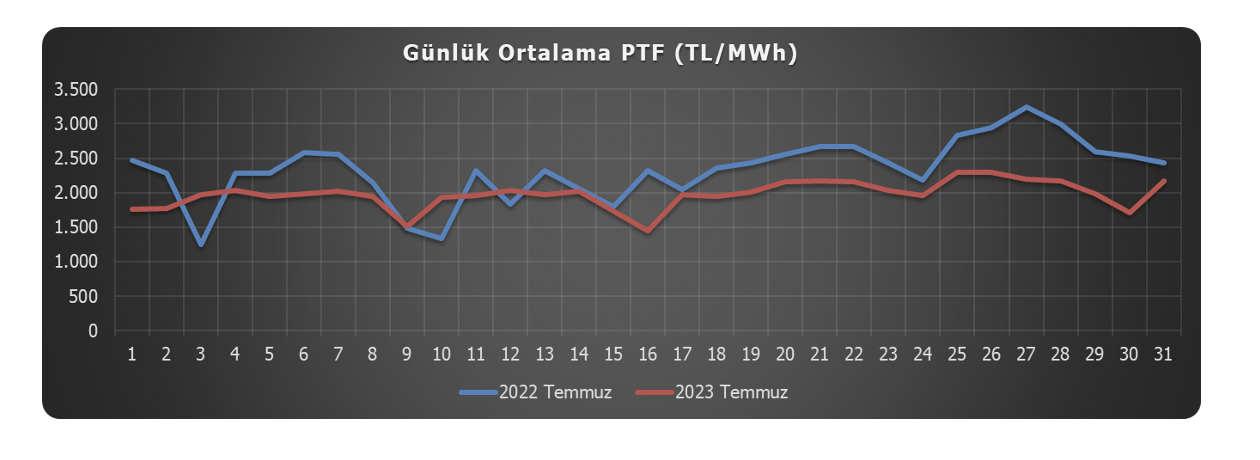 2022 yılı Temmuz ayında 2.330,37 TL/MWh olarak gerçekleşen ortalama piyasa takas fiyatı (PTF), 2023 yılı Temmuz ayında, bir önceki yıla göre %15,1 oranında azalarak 1.977,40 TL/MWh olarak kaydedilmiştir. Bu dönemde gerçekleşen ortalama PTF, bir önceki aya göre (1.623,92 TL/MWh) %21,8 oranında artış göstermiştir.