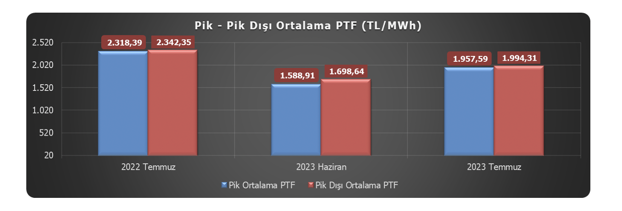 2023 yılı Temmuz ayında pik saatlerde[5] 1.957,59 TL/MWh olarak gerçekleşen ortalama PTF, bir önceki ayın pik saatler ortalaması olan 1.588,91 TL/MWh’lik değere göre %23,2 oranında artmıştır[6].