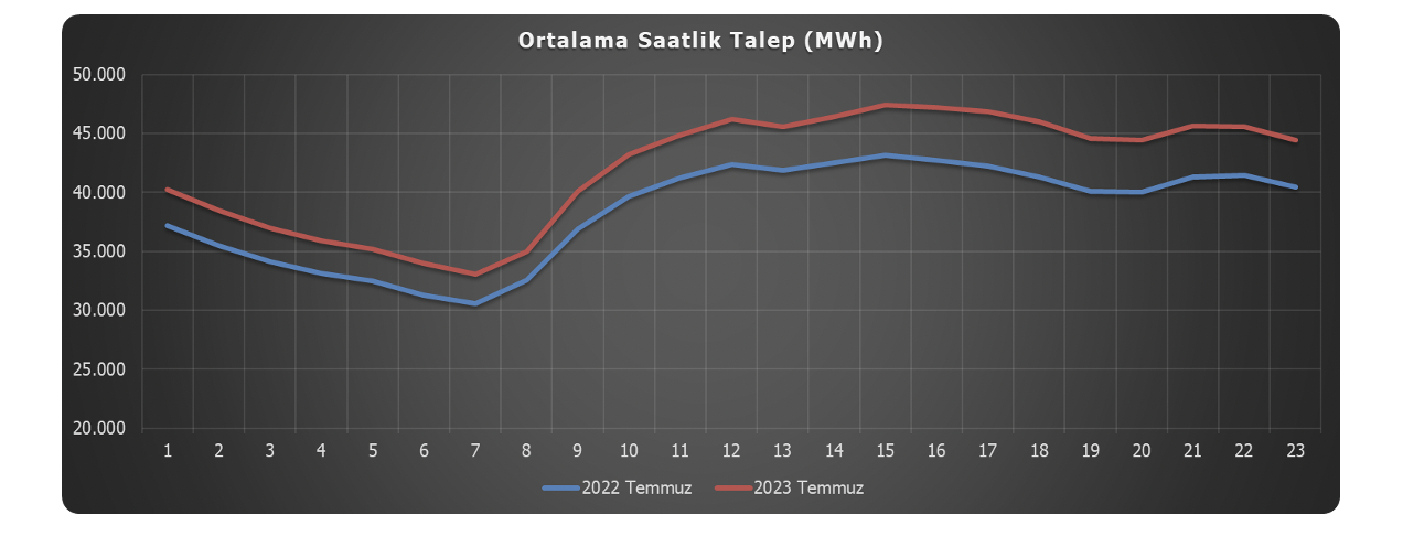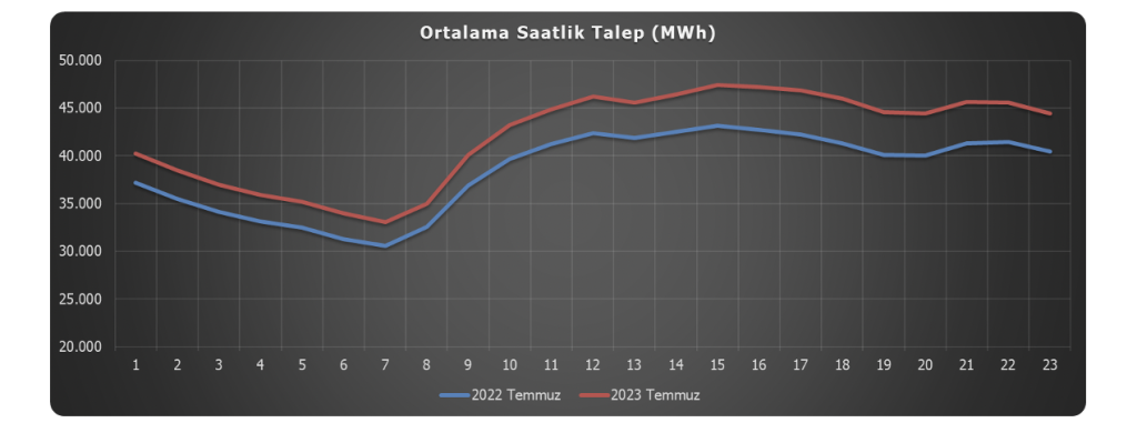 2022 yılı Temmuz ayı içerisinde toplam 29,171 GWh olan elektrik talebi, 2023 yılı Temmuz ayında bir önceki yıla göre %7,31 oranında artış göstererek, 31,303 GWh değerine ulaşmıştır[7]. 2022 yılı Temmuz ayında 38.457 MWh olarak ölçülen saatlik ortalama talep, 2023 yılı Temmuz ayında 42.075 MWh olarak gerçekleşmiştir.