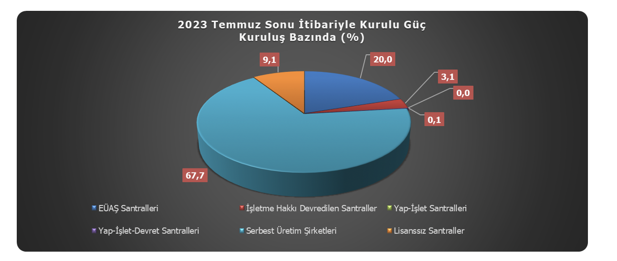 Toplam kurulu gücün %67,7’lik (71.104 MW) kısmını serbest üretim şirketleri oluştururken, EÜAŞ santrallerinin toplam kurulu güçteki payı %20,0 (21.025 MW) seviyesindedir[8]. Yap işlet devret santralleri %0,1’lik (116 MW), işletme hakkı devredilen santraller %3,1’lik (3,244 MW) bir orana sahiptir. Lisanssız santrallerin toplam kurulu güç içindeki payı da %9,1 (9.577 MW) olarak kaydedilmiştir.