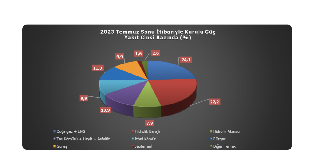 2023 yılı Temmuz ayı sonunda oluşan toplam kurulu gücün %24,1’lik kısmı (25.362 MW) doğal gaz ve LNG yakıt tipi santralleri ile karşılanırken, %22,2’lik kısmı (23.282 MW) barajlı hidrolik santraller tarafından karşılanmaktadır. Bu yakıt tiplerini %10,9’luk (11.441 MW) oran ile yerli kömür[9] santralleri ve %9,9’luk oran (10.374 MW) ile ithal kömür santralleri izlemektedir. Akarsu tipi hidrolik santraller %7,9’luk bir orana (8.310 MW) sahipken, rüzgâr santralleri toplam kurulu gücün %11,0’lık bir kısmını (11.569 MW) oluşturmaktadır[10]. Toplam kurulu gücün %9,9’luk kısmı (10.352 MW) güneş enerjisi santralleri, %1,6’lık kısmı (1.691 MW) jeotermal enerji santrallerinden oluşurken, %2,6’lık kısmı (2.685 MW) ise diğer termik santraller[11] tarafından oluşturulmaktadır.