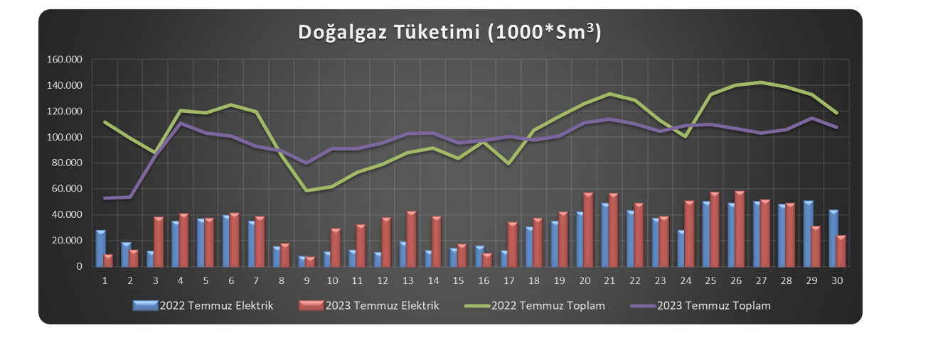 [12] 2023 yılı Temmuz ayı Elektrik üretimi için tüketilen toplam doğal gaz miktarı, T.C. Enerji ve Tabii Kaynaklar Bakanlığı Enerji İşleri Genel Müdürlüğü raporlarından alınmaktadır. Alınan veriler 2023 Temmuz ayının 30 günlük verileri olup karşılaştırmak için 2022 yılı Temmuz ayının 30 günlük verileri kullanılmıştır.