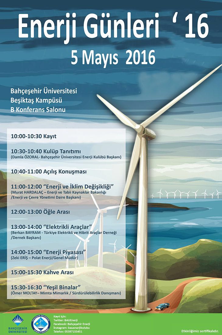 Bahçeşehir Üniversitesi Enerji Kulübü, Enerji Günleri ’16 etkinliğini 5 Mayıs 2016 tarihinde Bahçeşehir Üniversitesi Beşiktaş Kampüsü’nde gerçekleştirilecek.