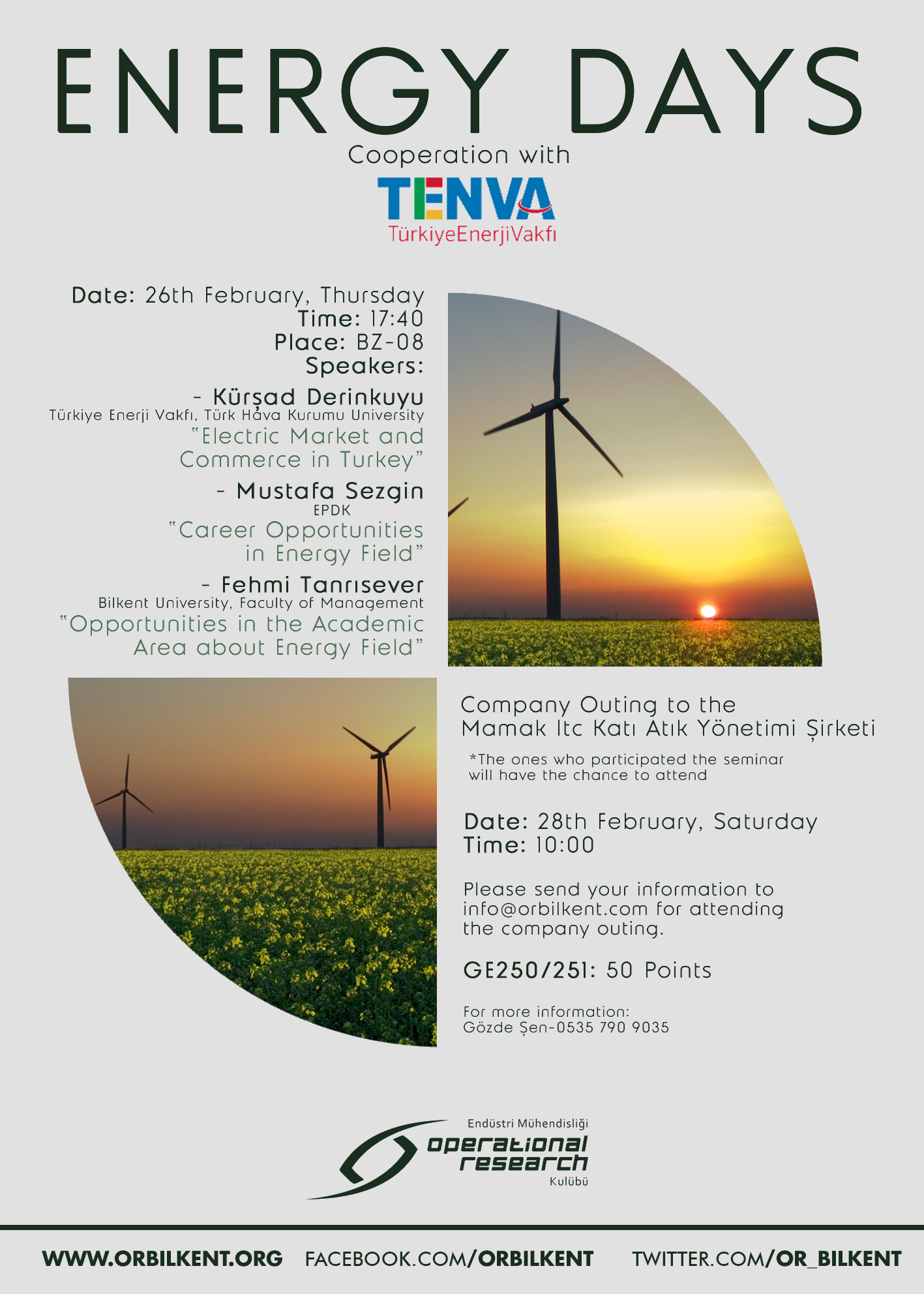 TENVA ve Bilkent OR’un işbirliğinde düzenlenen ve enerji sektörüne özel sunumlar ve saha gezisinden oluşan “Energy Days” etkinliği, 26 Şubat ve 28 Şubat 2015 tarihlerinde gerçekleşecek.