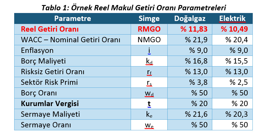 Formülden anlaşılacağı üzere, EPDK tarafından belirlenen Nominal Makul Getiri Oranı, Kurumlar Vergisi de dikkate alınmak suretiyle hesaplanan, Şirketin ağırlıklı ortalama sermaye maliyetidir. Mevcut durumda belirlenmiş olan %11,83 yıllık reel makul getiri oranına (%11,17 yıl ortası RMGO’ya) Tablo 1’deki örnek parametreler kullanılarak ulaşılabilir. Ancak bu parametrelerin EPDK hesaplamalarında kullanılan parametreler değil, örnek teşkil etmesi amacıyla belirlenmiş değerler olduğu bilinmelidir.