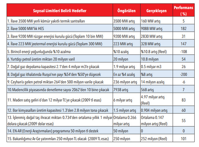 Beş yıllık zaman zarfında belirlenen 15 hedeften sadece 3 tanesinin hedefleri aştığını görmekteyiz. Hidroelektrik ve jeotermal konusunda belirlenen hedefler aşılmışken rüzgâr zayıf bir performans göstermiş kömürde ise kayda değer hiçbir şey yapılamamıştır. Enerji verimliliğinde ise azalış beklerken tam tersi bir artış ile karşı karşıyayız.