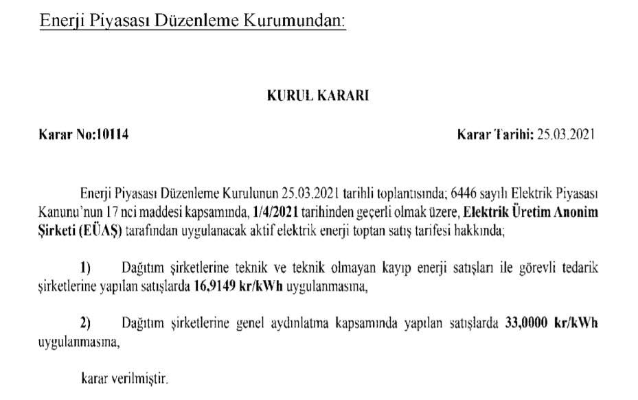 EPDK’nın kararına göre, tedarik şirketlerine yapılan satışlarda uygulanacak fiyatta yüzde 21,2 oranında indirim yapıldı. Resmi Gazete’de 26 Mart 2021 tarihinde yayınlanan karar uyarınca 1 Nisan’dan itibaren yeni fiyat 16.9149 kr/kWh olarak uygulanacak.